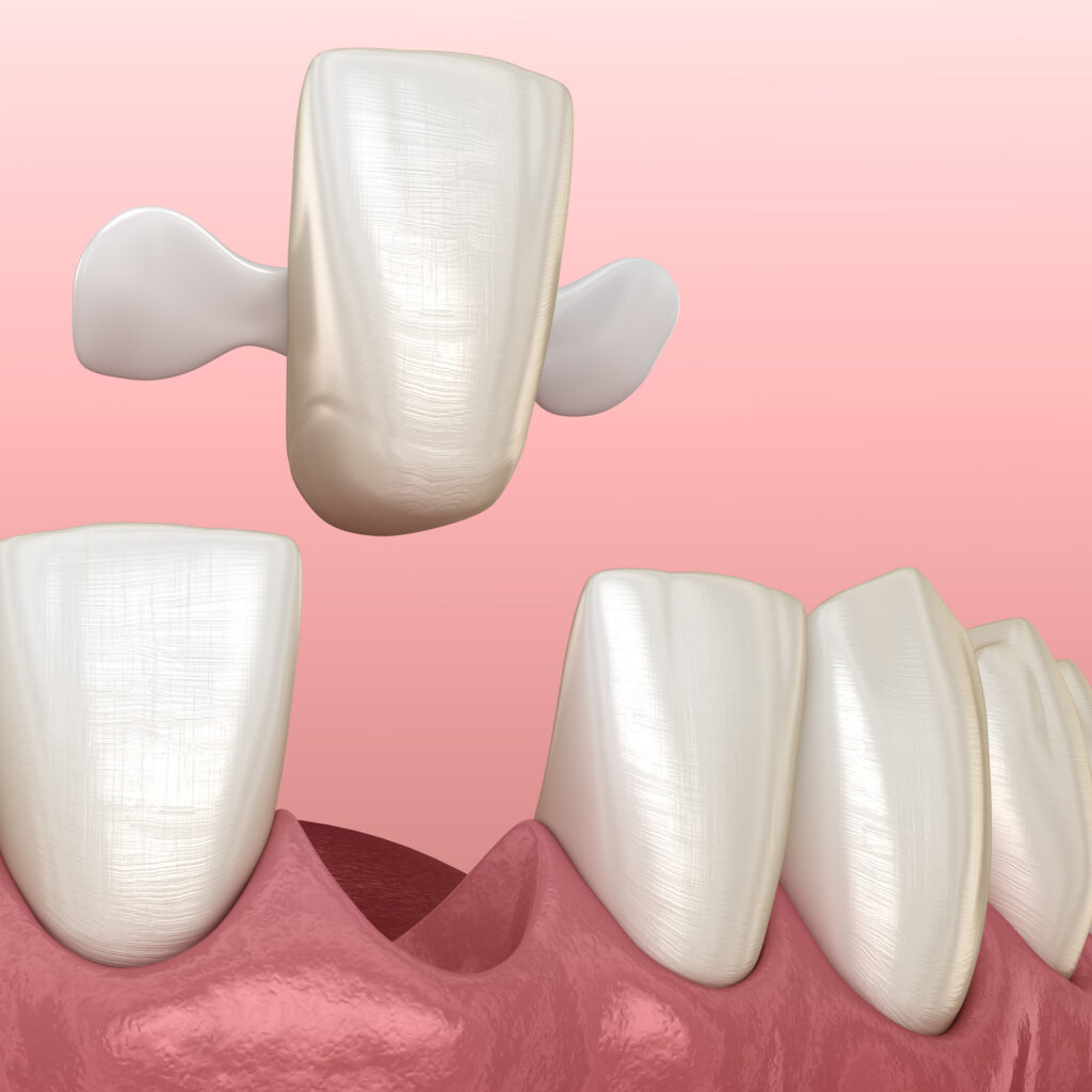 ラミネートベニアとは、前歯の表面を薄く削り、そこに歯の形をしたセラミック製の薄い板を貼りつける治療のことを言います。これにより、前歯の色や形を整えることができます。クラウンを被せることで歯を白くするには、歯を多く削る必要があります。